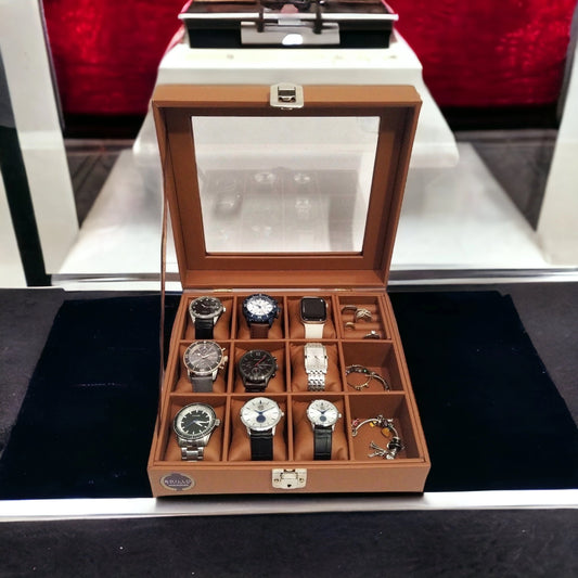Organizador de Relojes y Joyas de Lujo Marrón Barcelona · 9 Puestos + Compartimentos Extras