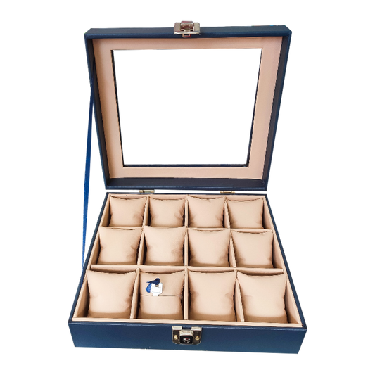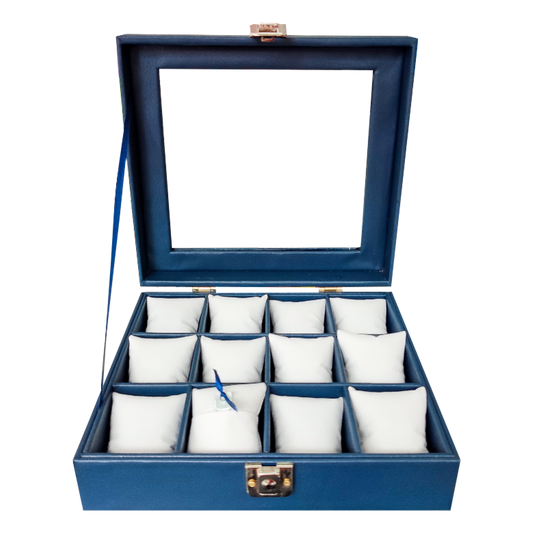 Organizador de Relojes de Lujo Azul y Blanco | Estuche Elegante 12 Puestos con Tapa de Vidrio y Almohadillas Individuales