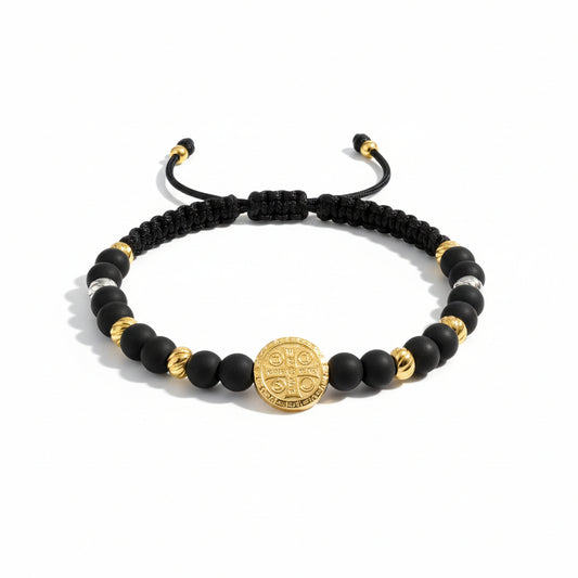 Pulsera ORO18K con balines tamaño #5 y dije San Benito para hombre