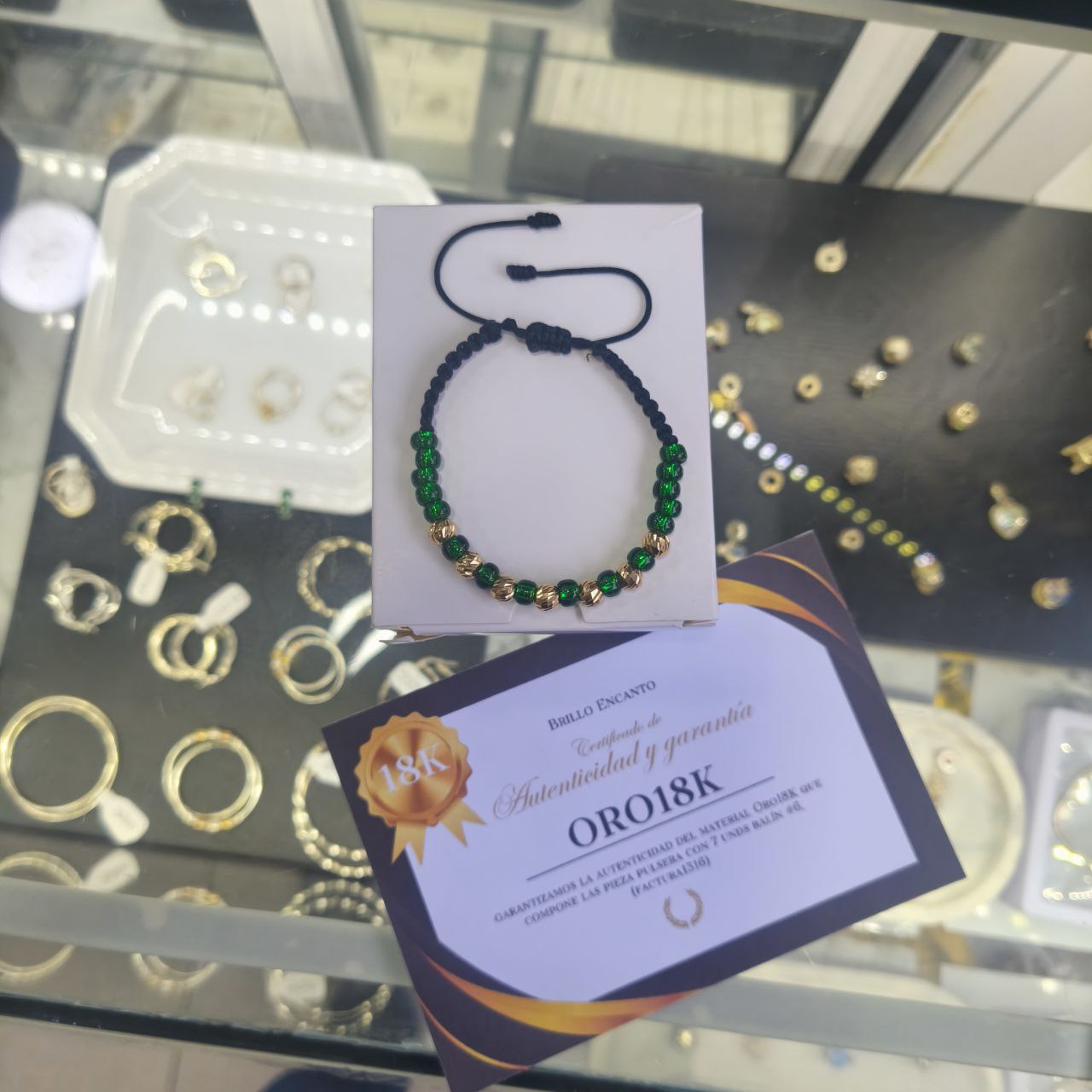 Eleva tu estilo con esta pulsera unisex en oro 18K auténtico, elaborada a mano por artesanos colombianos. Su diseño incluye 7 balines diamantados tamaño #6, hilo terlenca de alta resistencia y detalles en mostacilla verde esmeralda que aportan elegancia y un toque de energía.